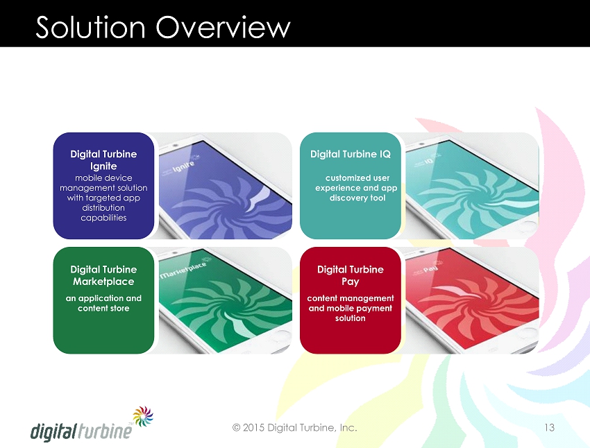 What will make our businesses have sustainable differentiation ? 1 2 Appia Core Appia Core – Able to run a profitable performance app - install business while building an APK managed DSP and leveraging DT Ad Units for Publishers Digital Turbine Media Digital Turbine Media – Unique Ad Units as the owner of the homescreen of the device Sustainable Differentiation © 2015 Digital Turbine, Inc. 12