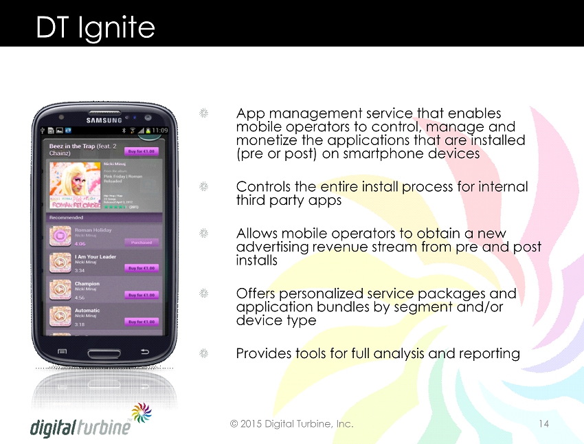 Solution Overview mobile device management solution with targeted app distribution capabilities Digital Turbine Ignite customized user experience and app discovery tool Digital Turbine IQ an application and content store Digital Turbine Marketplace Digital Turbine Pay content management and mobile payment solution © 2015 Digital Turbine, Inc. 13