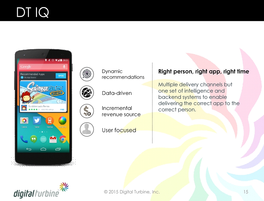 DT Ignite App management service that enables mobile operators to control, manage and monetize the applications that are installed (pre or post) on smartphone devices Controls the entire install process for internal third party apps Allows mobile operators to obtain a new advertising revenue stream from pre and post installs Offers personalized service packages and application bundles by segment and/or device type Provides tools for full analysis and reporting © 2015 Digital Turbine, Inc. 14