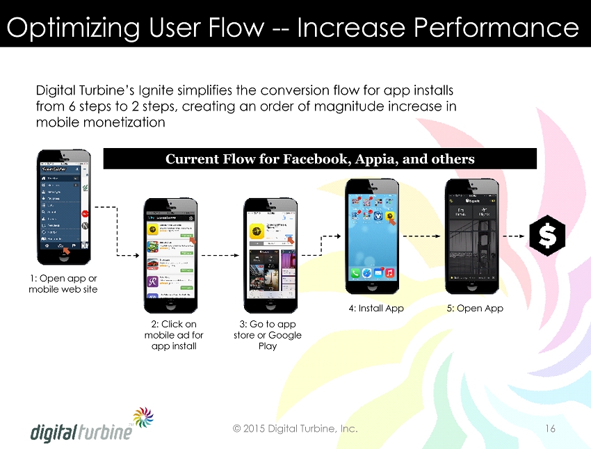 Dynamic recommendations User focused Incremental revenue source Data - driven Multiple delivery channels but one set of intelligence and backend systems to enable delivering the correct app to the correct person. Right person, right app, right time DT IQ © 2015 Digital Turbine, Inc. 15