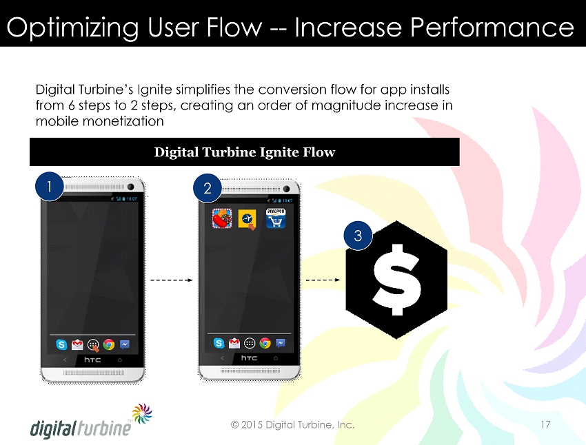 Digital Turbine’s Ignite simplifies the conversion flow for app installs from 6 steps to 2 steps, creating an order of magnitude increase in mobile monetization 1: Open app or mobile web site Current Flow for Facebook, Appia, and others 2: Click on mobile ad for app install 3: Go to app store or Google Play 4: Install App 5: Open App © 2015 Digital Turbine, Inc. 16 Optimizing User Flow -- Increase Performance