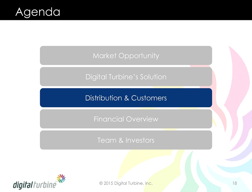 Agenda Market Opportunity Digital Turbine’s Solution Distribution & Customers Team & Investors Financial Overview © 2015 Digital Turbine, Inc. 18