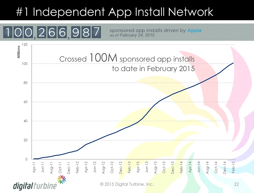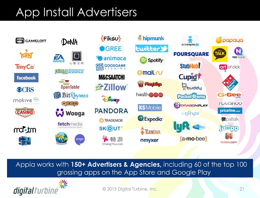 App Install Advertisers Appia works with 150 + Advertisers & Agencies, including 60 of the top 100 grossing apps on the App Store and Google Play © 2015 Digital Turbine, Inc. 21