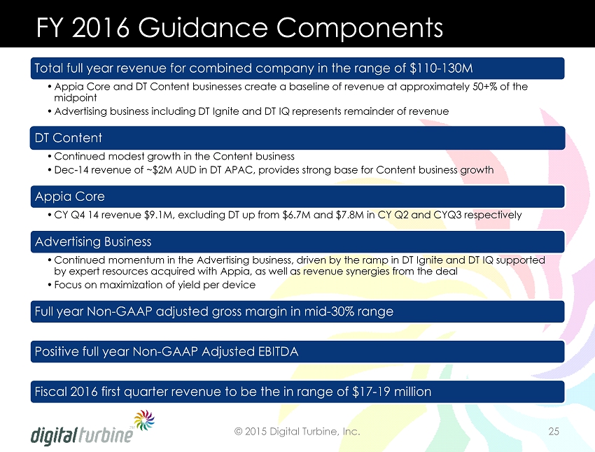 Revenue Guidance – FY 15 and FY 16 $28M - $32M $58M - $62M $110M - $130M $0M $20M $40M $60M $80M $100M $120M $140M FY15 As-reported basis FY15 Pro Forma* FY16 Guidance * Assumes Appia owned for full fiscal year 2015 © 2015 Digital Turbine, Inc. 24