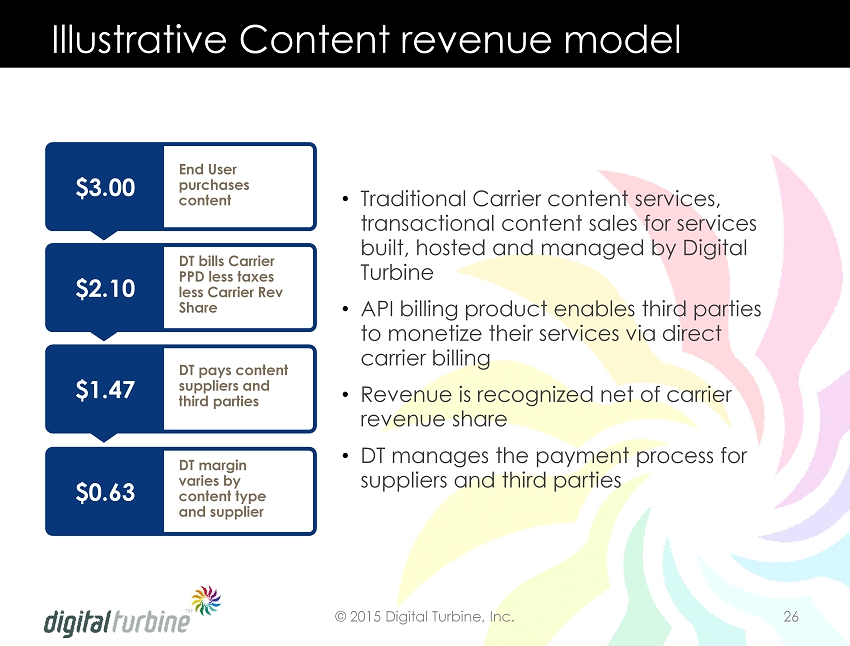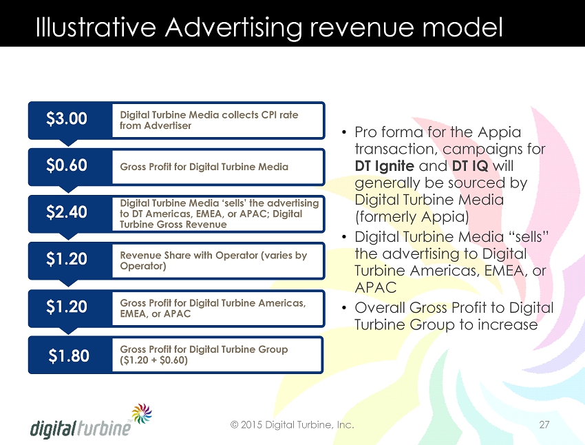 Illustrative Content revenue model End User purchases content • Traditional Carrier content services, transactional content sales for services built, hosted and managed by Digital Turbine • API billing product enables third parties to monetize their services via direct carrier billing • Revenue is recognized net of carrier revenue share • DT manages the payment process for suppliers and third parties $3.00 $2.10 DT bills Carrier PPD less t axes less C arrier R ev Share $1.47 DT pays content suppliers and third parties $0.63 DT margin varies by content type and supplier © 2015 Digital Turbine, Inc. 26