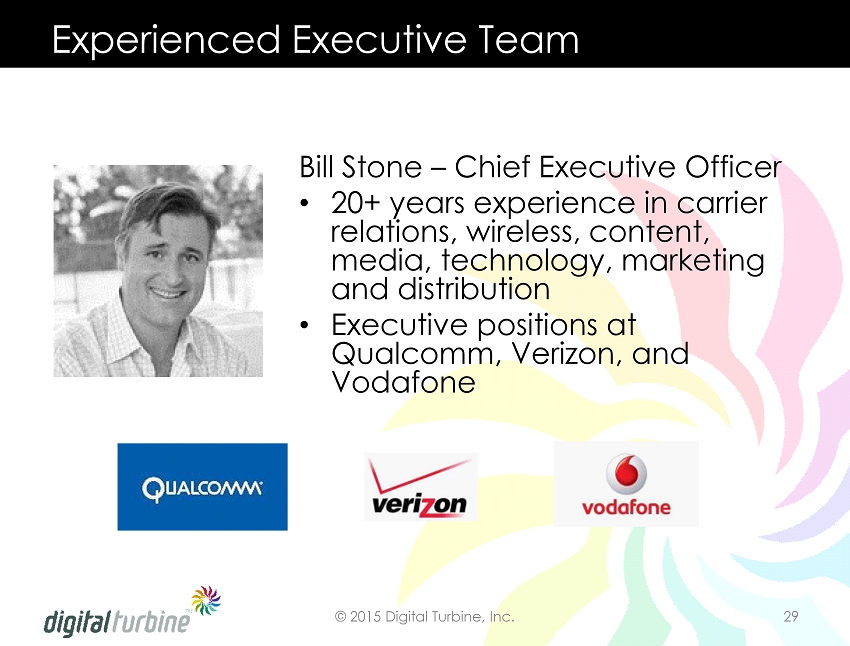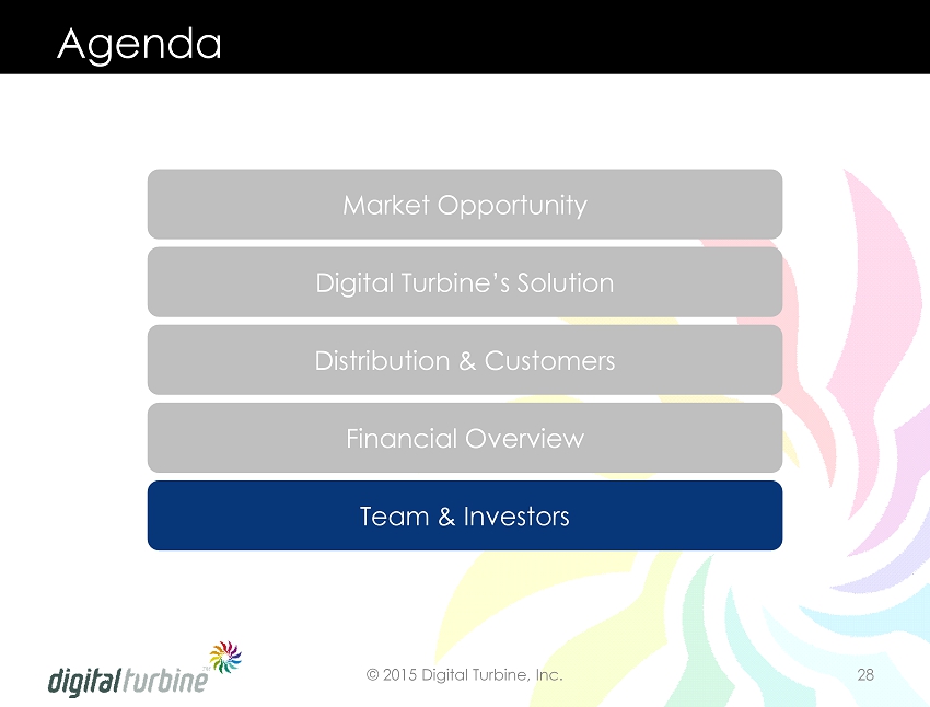 Agenda Market Opportunity Digital Turbine’s Solution Distribution & Customers Team & Investors Financial Overview © 2015 Digital Turbine, Inc. 28
