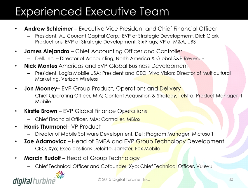 Experienced Executive Team Bill Stone – Chief Executive Officer • 20+ years experience in carrier relations, wireless, content, media, technology, marketing and distribution • Executive positions at Qualcomm, Verizon, and Vodafone © 2015 Digital Turbine, Inc. 29