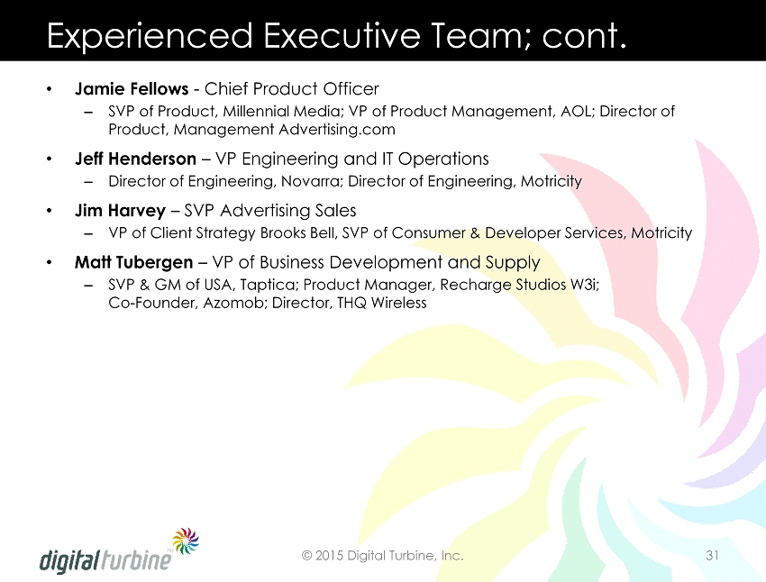 Experienced Executive Team • Andrew Schleimer – Executive Vice President and Chief Financial Officer – President, Au Courant Capital Corp .; EVP of Strategic Development, Dick Clark Productions; EVP of Strategic Development, Six Flags; VP of M&A, UBS • James Alejandro – Chief Accounting Officer and Controller – Dell, Inc. – Director of Accounting, North America & Global S&P Revenu e • Nick Montes Americas and EVP Global Business Development – President, Logia Mobile USA; President and CEO, Viva Vision; Director of Multicultural Marketing, Verizon Wireless • Jon Mooney – EVP Group Product, Operations and Delivery – Chief Operating Officer, MIA; Content Acquisition & Strategy, Telstra; Product Manager, T - Mobile • Kirstie Brown – EVP Global Finance Operations – Chief Financial Officer, MIA; Controller, MBlox • Harris Thurmond – VP Product – Director of Mobile Software Development, Dell; Program Manager, Microsoft • Zoe Adamovicz – Head of EMEA and EVP Group Technology Development – CEO, Xyo ; Exec positions Deloitte, Jamster , Fox Mobile • Marcin Rudolf – Head of Group Technology – Chief Technical Officer and Cofounder, Xyo ; Chief Technical Officer, Vulevu © 2015 Digital Turbine, Inc. 30