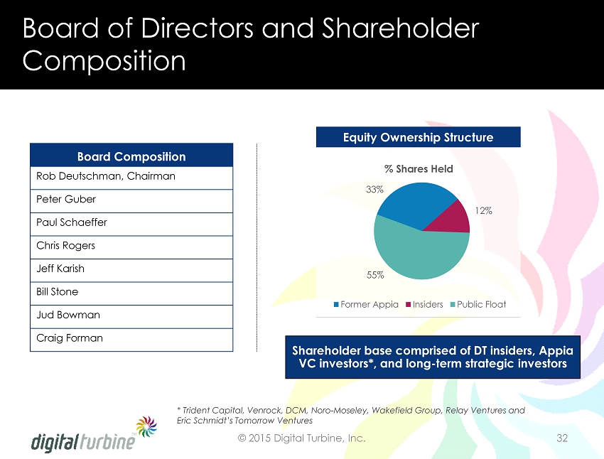 Experienced Executive Team; cont . • Jamie Fellows - Chief Product Officer – SVP of Product, Millennial Media; VP of Product Management, AOL; Director of Product, Management Advertising.com • Jeff Henderson – VP Engineering and IT Operations – Director of Engineering, Novarra; Director of Engineering, Motricity • Jim Harvey – SVP Advertising Sales – VP of Client Strategy Brooks Bell, SVP of Consumer & Developer Services, Motricity • Matt Tubergen – VP of Business Development and Supply – SVP & GM of USA, Taptica; Product Manager, Recharge Studios W3i; Co - Founder, Azomob; Director, THQ Wireless © 2015 Digital Turbine, Inc. 31