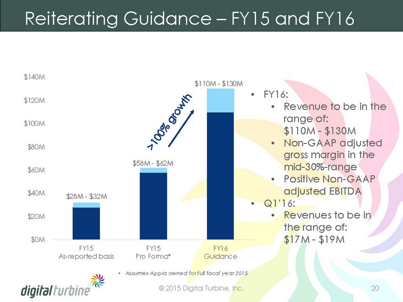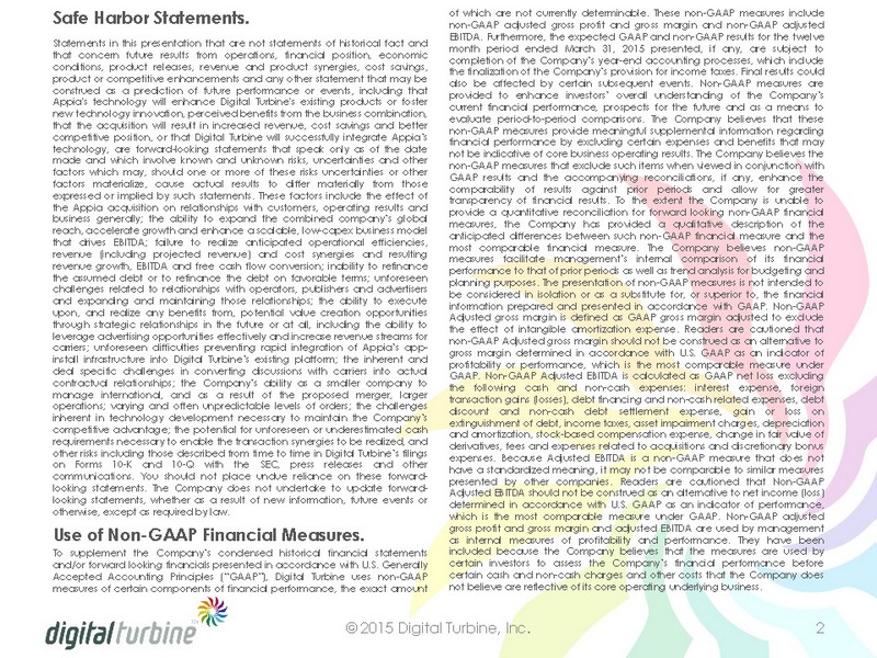 d which involve known and unknown risks, uncertainties and other factors which may, should one or more of these risks uncertainties or other factors materialize, cause actual results to differ materially from those expressed or implied by such statements . These factors include the effect of the Appia acquisition on relationships with customers, operating results and business generally ; the ability to expand the combined company’s global reach, accelerate growth and enhance a scalable, low - capex business model that drives EBITDA ; failure to realize anticipated operational efficiencies, revenue (including projected revenue) and cost synergies and resulting revenue growth, EBITDA and free cash flow conversion ; inability to refinance the assumed debt or to refinance the debt on favorable terms ; unforeseen challenges related to relationships with operators, publishers and advertisers and expanding and maintaining those relationships ; the ability to execute upon, and realize any benefits from, potential value creation opportunities through strategic relationships in the future or at all, including the ability to leverage advertising opportunities effectively and increase revenue streams for carriers ; unforeseen difficulties preventing rapid integration of Appia’s app - install infrastructure into Digital Turbine’s existing platform ; the inherent and deal specific challenges in converting discussions with carriers into actual contractual relationships ; the Company’s ability as a smaller company to manage international, and as a result of the proposed merger, larger operations ; varying and often unpredictable levels of orders ; the challenges inherent in technology development necessary to maintain the Company’s competitive advantage ; the potential for unforeseen or underestimated cash requirements necessary to enable the transaction synergies to be realized, and other risks including those described from time to time in Digital Turbine’s filings on Forms 10 - K and 10 - Q with the SEC, press releases and other communications . You should not place undue reliance on these forward - looking statements . The Company does not undertake to update forward - looking statements, whether as a result of new information, future events or otherwise, except as required by law . Use of Non - GAAP Financial Measures . To supplement the Company’s condensed historical financial statements and/or forward looking financials presented in accordance with U . S . Generally Accepted Accounting Principles (“GAAP”), Digital Turbine uses non - GAAP measures of certain components of financial performance, the exact amount of which are not currently determinable . These non - GAAP measures include non - GAAP adjusted gross profit and gross margin and non - GAAP adjusted EBITDA . Furthermore, the expected GAAP and non - GAAP results for the twelve month period ended March 31 , 2015 presented, if any, are subject to completion of the Company’s year - end accounting processes, which include the finalization of the Company’s provision for income taxes . Final results could also be affected by certain subsequent events . Non - GAAP measures are provided to enhance investors’ overall understanding of the Company’s current financial performance, prospects for the future and as a means to evaluate period - to - period comparisons . The Company believes that these non - GAAP measures provide meaningful supplemental information regarding financial performance by excluding certain expenses and benefits that may not be indicative of core business operating results . The Company believes the non - GAAP measures that exclude such items when viewed in conjunction with GAAP results and the accompanying reconciliations, if any, enhance the comparability of results against prior periods and allow for greater transparency of financial results . To the extent the Company is unable to provide a quantitative reconciliation for forward looking non - GAAP financial measures, the Company has provided a qualitative description of the anticipated differences between such non - GAAP financial measure and the most comparable financial measure . The Company believes non - GAAP measures facilitate management’s internal comparison of its financial performance to that of prior periods as well as trend analysis for budgeting and planning purposes . The presentation of non - GAAP measures is not intended to be considered in isolation or as a substitute for, or superior to, the financial information prepared and presented in accordance with GAAP . Non - GAAP Adjusted gross margin is defined as GAAP gross margin adjusted to exclude the effect of intangible amortization expense . Readers are cautioned that non - GAAP Adjusted gross margin should not be construed as an alternative to gross margin determined in accordance with U . S . GAAP as an indicator of profitability or performance, which is the most comparable measure under GAAP . Non - GAAP Adjusted EBITDA is calculated as GAAP net loss excluding the following cash and non - cash expenses : interest expense, foreign transaction gains (losses), debt financing and non - cash related expenses, debt discount and non - cash debt settlement expense, gain or loss on extinguishment of debt, income taxes, asset impairment charges, depreciation and amortization, stock - based compensation expense, change in fair value of derivatives, fees and expenses related to acquisitions and discretionary bonus expenses . Because Adjusted EBITDA is a non - GAAP measure that does not have a standardized meaning, it may not be comparable to similar measures presented by other companies . Readers are cautioned that Non - GAAP Adjusted EBITDA should not be construed as an alternative to net income (loss) determined in accordance with U . S . GAAP as an indicator of performance, which is the most comparable measure under GAAP . Non - GAAP adjusted gross profit and gross margin and adjusted E