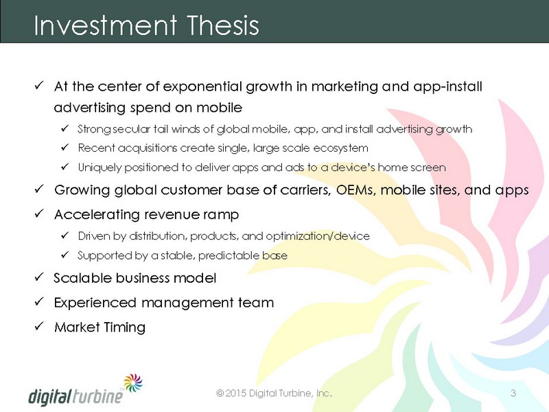 Safe Harbor Statements. Statements in this presentation that are not statements of historical fact and that concern future results from operations, financial position, economic conditions, product releases, revenue and product synergies, cost savings, product or competitive enhancements and any other statement that may be construed as a prediction of future performance or events, including that Appia's technology will enhance Digital Turbine's existing products or foster new technology innovation, perceived benefits from the business combination, that the acquisition will result in increased revenue, cost savings and better competitive position, or that Digital Turbine will successfully integrate Appia’s technology, are forward - looking statements that speak only as of the date made an