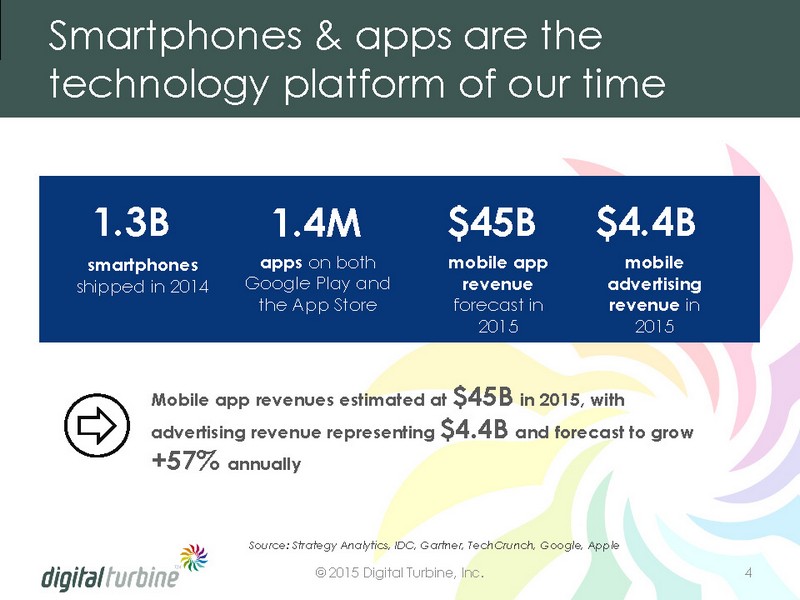 Investment Thesis x At the center of exponential growth in marketing and app - install advertising spend on mobile x Strong secular tail winds of global mobile, app, and install advertising growth x Recent acquisitions create single, large scale ecosystem x Uniquely positioned to deliver apps and ads to a device’s home screen x Growing global customer base of carriers, OEMs, mobile sites, and apps x Accelerating revenue ramp x Driven by distribution, products, and optimization/device x Supported by a stable, predictable base x Scalable business model x Experienced management team x Market Timing © 2015 Digital Turbine, Inc. 3