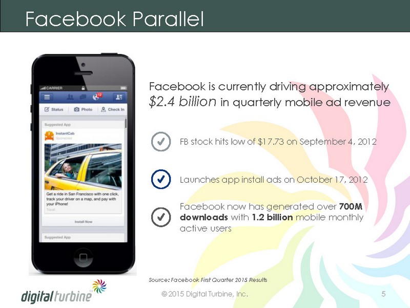 Smartphones & apps are the technology platform of our time © 2015 Digital Turbine, Inc. 4 Mobile app revenues estimated at $45B in 2015, with advertising revenue representing $4.4B and forecast to grow +57% annually Source: Strategy Analytics, IDC, Gartner, TechCrunch, Google, Apple 1.3B 1.4M $45B smartphones shipped in 2014 apps on both Google Play and the App Store mobile app revenue forecast in 2015 $4.4B mobile advertising revenue in 2015