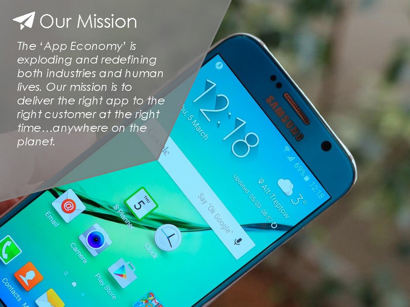 Our Mission The ‘App Economy’ is exploding and redefining both industries and human lives. Our mission is to deliver the right app to the right customer at the right time…anywhere on the planet.