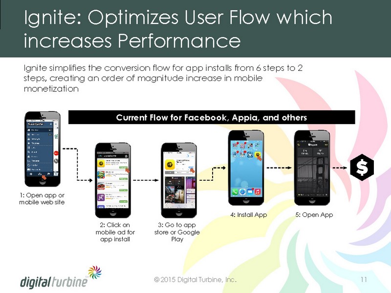 Product Overview mobile device management solution with targeted app distribution capabilities Digital Turbine Ignite customized user experience and app discovery tool Digital Turbine IQ an application and content store Digital Turbine Marketplace Digital Turbine Pay content management and mobile payment solution © 2015 Digital Turbine, Inc. 10