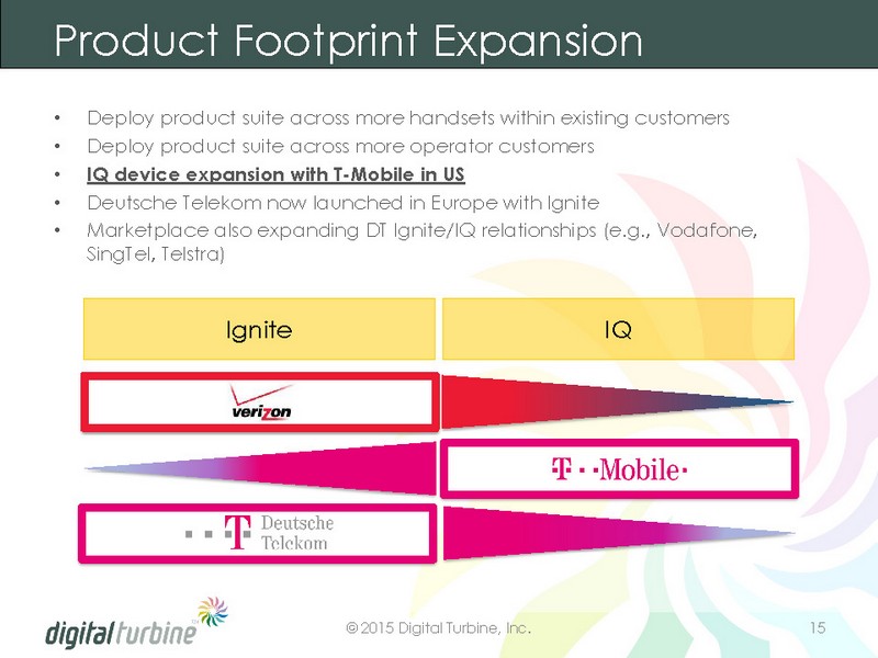 Product Footprint Expansion • Deploy product suite across more handsets within existing customers • Deploy product suite across more operator customers • IQ device expansion with T - Mobile in US • Deutsche Telekom now launched in Europe with Ignite • Marketplace also expanding DT Ignite/IQ relationships (e.g., Vodafone, SingTel, Telstra) © 2015 Digital Turbine, Inc. 15 Ignite I Q