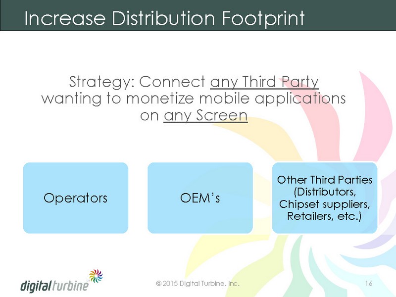 Increase Distribution Footprint Operators OEM’s Other Third Parties (Distributors, Chipset suppliers, Retailers, etc.) © 2015 Digital Turbine, Inc. 16 Strategy: Connect any Third Party wanting to monetize mobile applications on any Screen