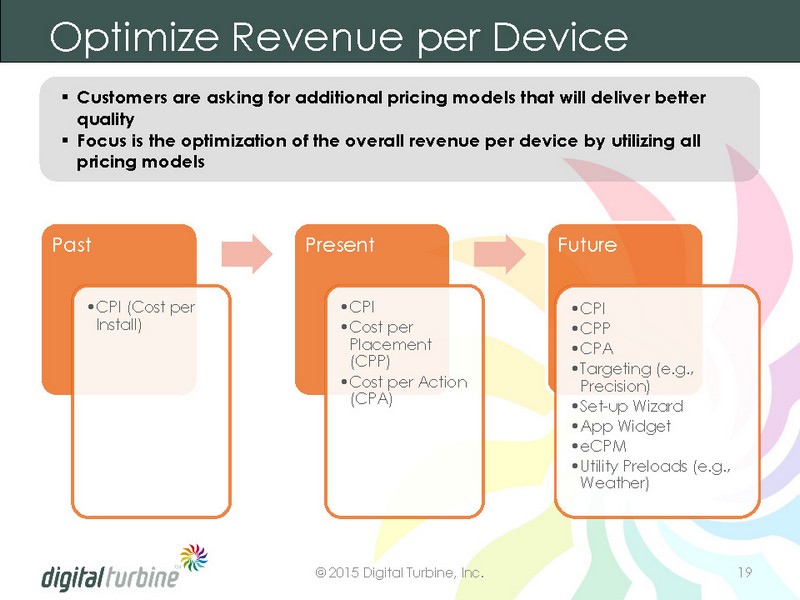 New OEM relationships ~30M devices shipped per year Sponsored App provider for BlinkFeed ~6M devices shipped per year Sponsored App provider for Tablets and Smartphones ~10M devices shipped per year Sponsored App provider for Tablets and Smartphones 1M devices shipped per year in EMEA Preloading Ignite on all Android devices © 2015 Digital Turbine, Inc. 18