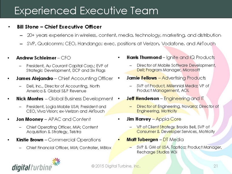Reiterating Guidance – FY15 and FY16 $28M - $32M $58M - $62M $110M - $130M $0M $20M $40M $60M $80M $100M $120M $140M FY15 As-reported basis FY15 Pro Forma* FY16 Guidance • Assumes Appia owned for full fiscal year 2015 © 2015 Digital Turbine, Inc. 20 • FY16: • Revenue to be in the range of: $110M - $130M • Non - GAAP adjusted gross margin in the mid - 30% - range • Positive Non - GAAP adjusted EBITDA • Q1’16: • Revenues to be in the range of: $17M - $19M