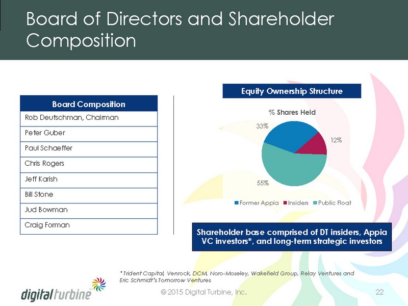 Experienced Executive Team • Bill Stone – Chief Executive Officer – 20+ years experience in wireless , content, media , technology, marketing, and distribution – SVP, Qualcomm; CEO, Handango; exec. positions at Verizon, Vodafone, and AirTouch © 2015 Digital Turbine, Inc. 21 • Andrew Schleimer – CFO – President, Au Courant Capital Corp.; EVP of Strategic Development, DCP and Six Flags • James Alejandro – Chief Accounting Officer – Dell , Inc ., Director of Accounting, North America & Global S&P Revenue • Nick Montes -- Global Business Development – President, Logia Mobile USA; President and CEO, Viva Vision; ex - Verizon and AirTouch • Jon Mooney – APAC and Content – Chief Operating Officer, MIA; Content Acquisition & Strategy, Telstra • Kirstie Brown – Commercial Operations – Chi