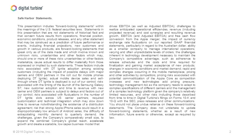 2 © 2016 Digital Turbine, Inc. Safe Harbor Statements . This presentation includes “forward - looking statements” within the meanings of the U . S . federal securities laws . Statements in this presentation that are not statements of historical fact and that concern future results from operations, financial position, economic conditions, product releases, and any other statement that may be construed as a prediction of future performance or events, including financial projections, new customers and growth in various products, are forward - looking statements that speak only as of the date made and which involve known and unknown risks, uncertainties and other factors which may, should one or more of these risks uncertainties or other factors materialize, cause actual results to differ materially from those expressed or implied by such statements . These factors include risks associated with DT Ignite adoption among existing customers (including the impact of possible delays with major carriers and OEM partners in the roll out for mobile phones deploying DT Ignite) ; actual mobile device sales and sell - through where DT Ignite is deployed is out of our control ; risks associated with the timing of the launch of the Samsung Galaxy S 7 ; new customer adoption and time to revenue with new carrier and OEM partners is subject to delays and factors out of our control ; risks associated with fluctuations in the number of DT Ignite slots across US carrier partners ; required customization and technical integration which may slow down time to revenue notwithstanding the existence of a distribution agreement ; risk that strong Apple iPhone sales could result in a disproportionately low amount of Android sales ; the difficulty of extrapolating monthly demand to quarterly demand ; the challenges, given the Company's comparatively small size, to expand the combined Company's global reach, accelerate growth and create a scalable, low capex business model that drives EBITDA (as well as Adjusted EBITDA) ; challenges to realize anticipated operational efficiencies, revenue (including projected revenue) and cost synergies and resulting revenue growth, EBITDA ( and Adjusted EBITDA) and free cash flow conversion from the Appia merger ; the impact of currency exchange rate fluctuations on our reported GAAP financial statements, particularly in regard to the Australian dollar ; ability as a smaller company to manage international operations ; varying and often unpredictable levels of orders ; the challenges inherent in technology development necessary to maintain the Company’s competitive advantage ; such as adherence to release schedules and the costs and time required for finalization and gaining market acceptance of new products ; changes in economic conditions and market demand ; rapid and complex changes occurring in the mobile marketplace ; pricing and other activities by competitors ; pricing risks associated with potential commoditization of the Appia Core as competition increases and new technologies add pricing pressure ; technology management risk as the company needs to adapt to complex specifications of different carriers and the management of a complex technology platform given the company's relatively limited resources, and other risks including those described from time to time in Digital Turbine’s filings on Forms 10 - K and 10 - Q with the SEC, press releases and other communications . You should not place undue reliance on these forward - looking statements . The Company does not undertake to update forward - looking statements, whether as a result of new information, future events or otherwise, except as required by law .