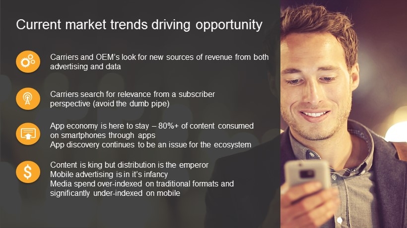 Carriers and OEM’s look for new sources of revenue from both advertising and data Current market trends driving opportunity Carriers search for relevance from a subscriber perspective (avoid the dumb pipe) App economy is here to stay – 80%+ of content consumed on smartphones through apps App discovery continues to be an issue for the ecosystem Content is king but distribution is the emperor Mobile advertising is in it’s infancy Media spend over - indexed on traditional formats and significantly under - indexed on mobile