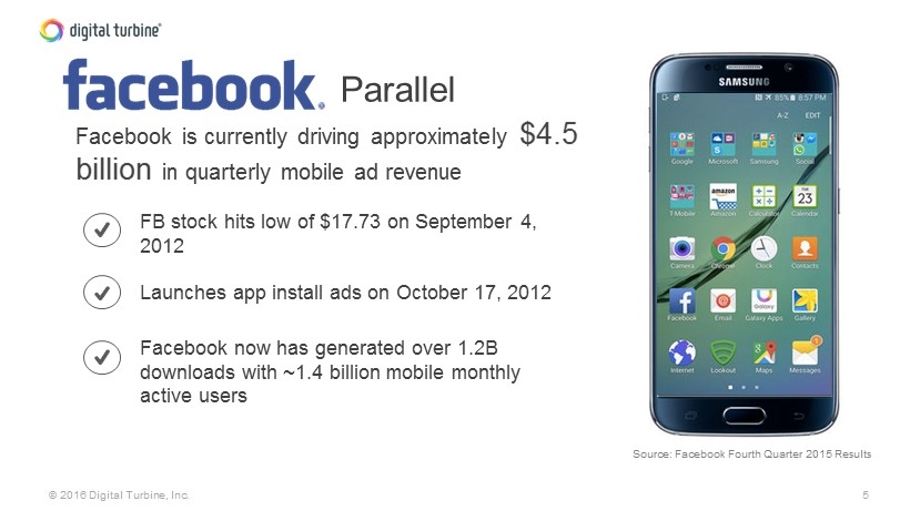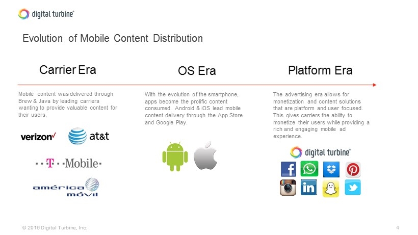 4 © 2016 Digital Turbine, Inc. Evolution of Mobile Content Distribution Mobile content was delivered through Brew & Java by leading carriers wanting to provide valuable content for their users. Carrier Era With the evolution of the smartphone, apps become the prolific content consumed. Android & iOS lead mobile content delivery through the App Store and Google Play. OS Era The advertising era allows for monetization and content solutions that are platform and user focused. This gives carriers the ability to monetize their users while providing a rich and engaging mobile ad experience. Platform Era