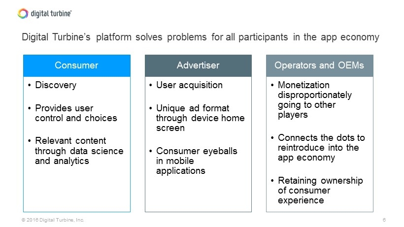 5 © 2016 Digital Turbine, Inc. Facebook is currently driving approximately $4.5 billion in quarterly mobile ad revenue FB stock hits low of $17.73 on September 4, 2012 Launches app install ads on October 17, 2012 Facebook now has generated over 1.2B downloads with ~1.4 billion mobile monthly active users Source: Facebook Fourth Quarter 2015 Results Parallel