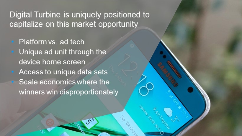 Digital Turbine is uniquely positioned to capitalize on this market opportunity • Platform vs. ad tech • Unique ad unit through the device home screen • Access to unique data sets • Scale economics where the winners win disproportionately