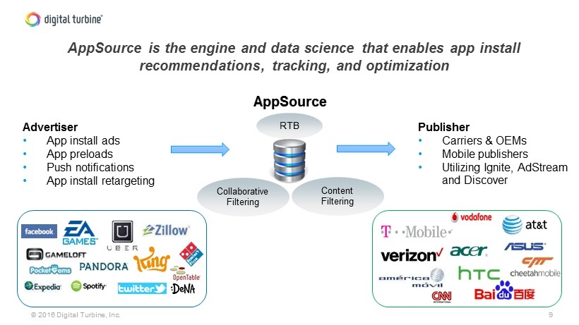 8 © 2016 Digital Turbine, Inc. Five Products Across Our T wo Operating Segments Marketplace White - Labelled Content Stores Pay Simple Mobile Billing Ignite Drive Quality App Installs AdStream New User Acquisition Content Discover App Search & Discovery Advertising