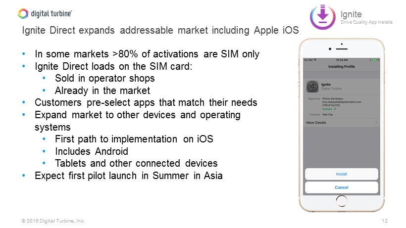 11 © 2016 Digital Turbine, Inc. Evolution of Ignite App Delivery – Multiple Go to Market Approaches Silent Wizard SDK Ignite Drive Quality App Installs Direct