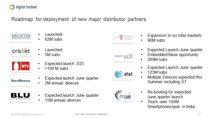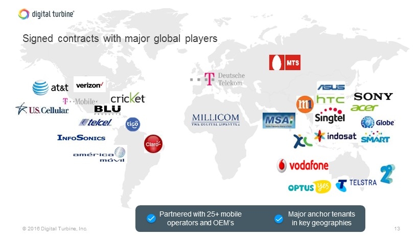 13 © 2016 Digital Turbine, Inc. Signed contracts with major global players Partnered with 25+ mobile operators and OEM’s Major anchor tenants in key geographies