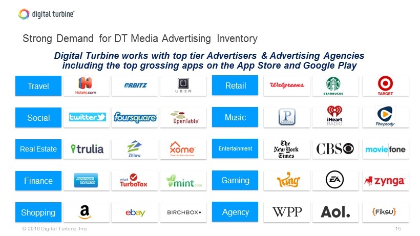 14 © 2016 Digital Turbine, Inc. Roadmap for deployment of new major distributor partners Source: Company websites • Launched • 62M subs • Launched • 5 M subs • Expected launch 3/25 • >100 M subs • Expected launch June quarter • 2M annual devices • Expected launch June quarter • 15M annual devices • Expansion to six total markets • 96M subs • Expected Launch June quarter • Embedded Base opportunity • 289M subs • Re - booting for expected June quarter launch • Touch over 100M Smartphones/year in India • Expected Launch June quarter • 123M subs • Multiple Devices expected this Summer including S7
