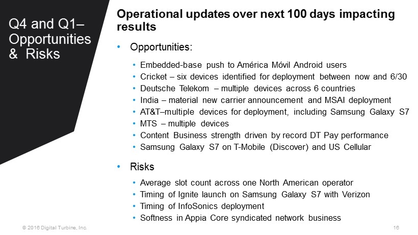 16 © 2016 Digital Turbine, Inc. Operational updates over next 100 days impacting results • Opportunities : • Embedded - base push to América Móvil Android users • Cricket – six devices identified for deployment between now and 6/30 • Deutsche Telekom – multiple devices across 6 countries • India – material new carrier announcement and MSAI deployment • AT&T – multiple devices for deployment , including Samsung Galaxy S7 • MTS – multiple devices • Content Business strength driven by record DT Pay performance • Samsung Galaxy S7 on T - Mobile (Discover) and US Cellular • Risks • Average slot count across one North American operator • Timing of Ignite launch on Samsung Galaxy S7 with Verizon • Timing of InfoSonics deployment • Softness in Appia Core syndicated network business Q4 and Q1 – Opportunities & Risks