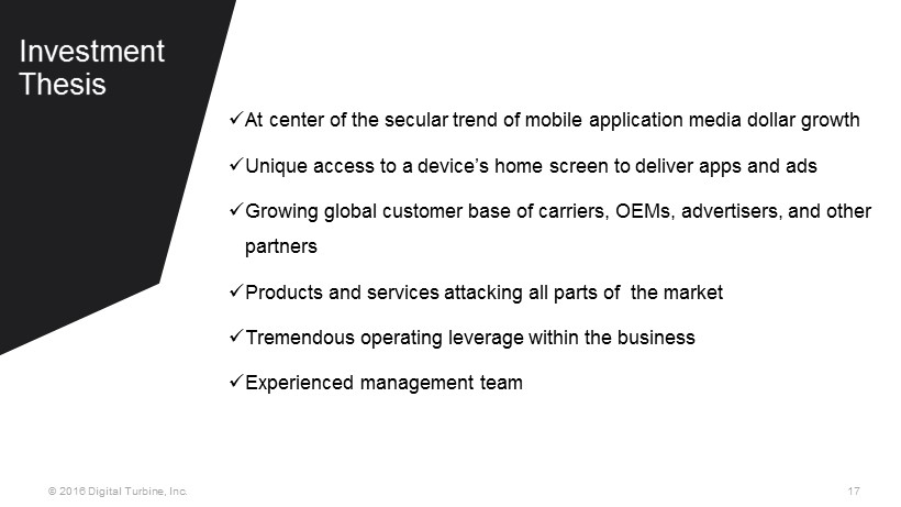 15 © 2016 Digital Turbine, Inc. Travel Social Real Estate Finance Strong Demand for DT Media Advertising Inventory Digital Turbine works with top tier Advertisers & Advertising Agencies including the top grossing apps on the App Store and Google Play Retail Music Entertainment Gaming Shopping Agency