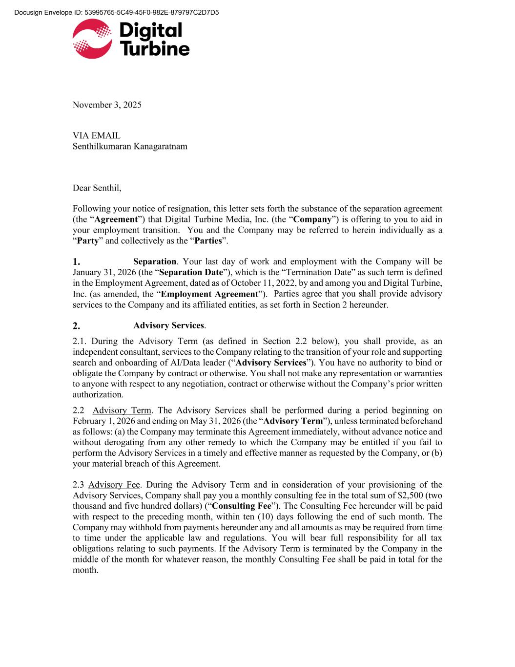 November 3, 2025 VIA EMAIL Senthilkumaran Kanagaratnam Dear Senthil, Following your notice of resignation, this letter sets forth the substance of the separation agreement (the “Agreement”) that Digital Turbine Media, Inc. (the “Company”) is offering to you to aid in your employment transition. You and the Company may be referred to herein individually as a “Party” and collectively as the “Parties”. 1. Separation. Your last day of work and employment with the Company will be January 31, 2026 (the “Separation Date”), which is the “Termination Date” as such term is defined in the Employment Agreement, dated as of October 11, 2022, by and among you and Digital Turbine, Inc. (as amended, the “Employment Agreement”). Parties agree that you shall provide advisory services to the Company and its affiliated entities, as set forth in Section 2 hereunder. 2. Advisory Services. 2.1. During the Advisory Term (as defined in Section 2.2 below), you shall provide, as an independent consultant, services to the Company relating to the transition of your role and supporting search and onboarding of AI/Data leader (“Advisory Services”). You have no authority to bind or obligate the Company by contract or otherwise. You shall not make any representation or warranties to anyone with respect to any negotiation, contract or otherwise without the Company’s prior written authorization. 2.2 Advisory Term. The Advisory Services shall be performed during a period beginning on February 1, 2026 and ending on May 31, 2026 (the “Advisory Term”), unless terminated beforehand as follows: (a) the Company may terminate this Agreement immediately, without advance notice and without derogating from any other remedy to which the Company may be entitled if you fail to perform the Advisory Services in a timely and effective manner as requested by the Company, or (b) your material breach of this Agreement. 2.3 Advisory Fee. During the Advisory Term and in consideration of your provisioning of the Advisory Services, Company shall pay you a monthly consulting fee in the total sum of $2,500 (two thousand and five hundred dollars) (“Consulting Fee”). The Consulting Fee hereunder will be paid with respect to the preceding month, within ten (10) days following the end of such month. The Company may withhold from payments hereunder any and all amounts as may be required from time to time under the applicable law and regulations. You will bear full responsibility for all tax obligations relating to such payments. If the Advisory Term is terminated by the Company in the middle of the month for whatever reason, the monthly Consulting Fee shall be paid in total for the month. Docusign Envelope ID: 53995765-5C49-45F0-982E-879797C2D7D5
