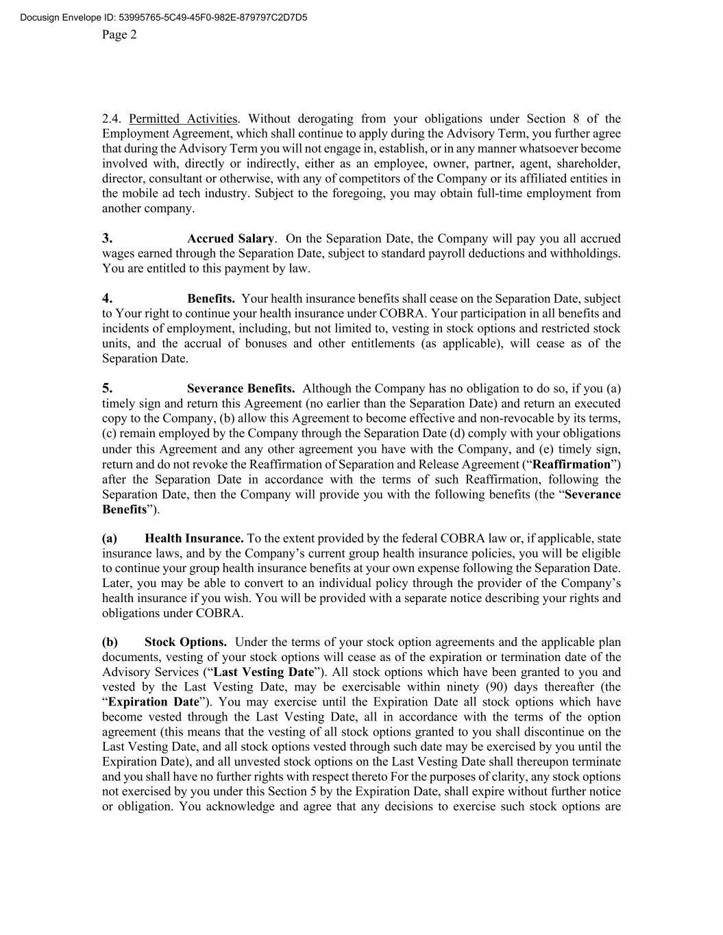 Page 2 2.4. Permitted Activities. Without derogating from your obligations under Section 8 of the Employment Agreement, which shall continue to apply during the Advisory Term, you further agree that during the Advisory Term you will not engage in, establish, or in any manner whatsoever become involved with, directly or indirectly, either as an employee, owner, partner, agent, shareholder, director, consultant or otherwise, with any of competitors of the Company or its affiliated entities in the mobile ad tech industry. Subject to the foregoing, you may obtain full-time employment from another company. 3. Accrued Salary. On the Separation Date, the Company will pay you all accrued wages earned through the Separation Date, subject to standard payroll deductions and withholdings. You are entitled to this payment by law. 4. Benefits. Your health insurance benefits shall cease on the Separation Date, subject to Your right to continue your health insurance under COBRA. Your participation in all benefits and incidents of employment, including, but not limited to, vesting in stock options and restricted stock units, and the accrual of bonuses and other entitlements (as applicable), will cease as of the Separation Date. 5. Severance Benefits. Although the Company has no obligation to do so, if you (a) timely sign and return this Agreement (no earlier than the Separation Date) and return an executed copy to the Company, (b) allow this Agreement to become effective and non-revocable by its terms, (c) remain employed by the Company through the Separation Date (d) comply with your obligations under this Agreement and any other agreement you have with the Company, and (e) timely sign, return and do not revoke the Reaffirmation of Separation and Release Agreement (“Reaffirmation”) after the Separation Date in accordance with the terms of such Reaffirmation, following the Separation Date, then the Company will provide you with the following benefits (the “Severance Benefits”). (a) Health Insurance. To the extent provided by the federal COBRA law or, if applicable, state insurance laws, and by the Company’s current group health insurance policies, you will be eligible to continue your group health insurance benefits at your own expense following the Separation Date. Later, you may be able to convert to an individual policy through the provider of the Company’s health insurance if you wish. You will be provided with a separate notice describing your rights and obligations under COBRA. (b) Stock Options. Under the terms of your stock option agreements and the applicable plan documents, vesting of your stock options will cease as of the expiration or termination date of the Advisory Services (“Last Vesting Date”). All stock options which have been granted to you and vested by the Last Vesting Date, may be exercisable within ninety (90) days thereafter (the “Expiration Date”). You may exercise until the Expiration Date all stock options which have become vested through the Last Vesting Date, all in accordance with the terms of the option agreement (this means that the vesting of all stock options granted to you shall discontinue on the Last Vesting Date, and all stock options vested through such date may be exercised by you until the Expiration Date), and all unvested stock options on the Last Vesting Date shall thereupon terminate and you shall have no further rights with respect thereto For the purposes of clarity, any stock options not exercised by you under this Section 5 by the Expiration Date, shall expire without further notice or obligation. You acknowledge and agree that any decisions to exercise such stock options are Docusign Envelope ID: 53995765-5C49-45F0-982E-879797C2D7D5