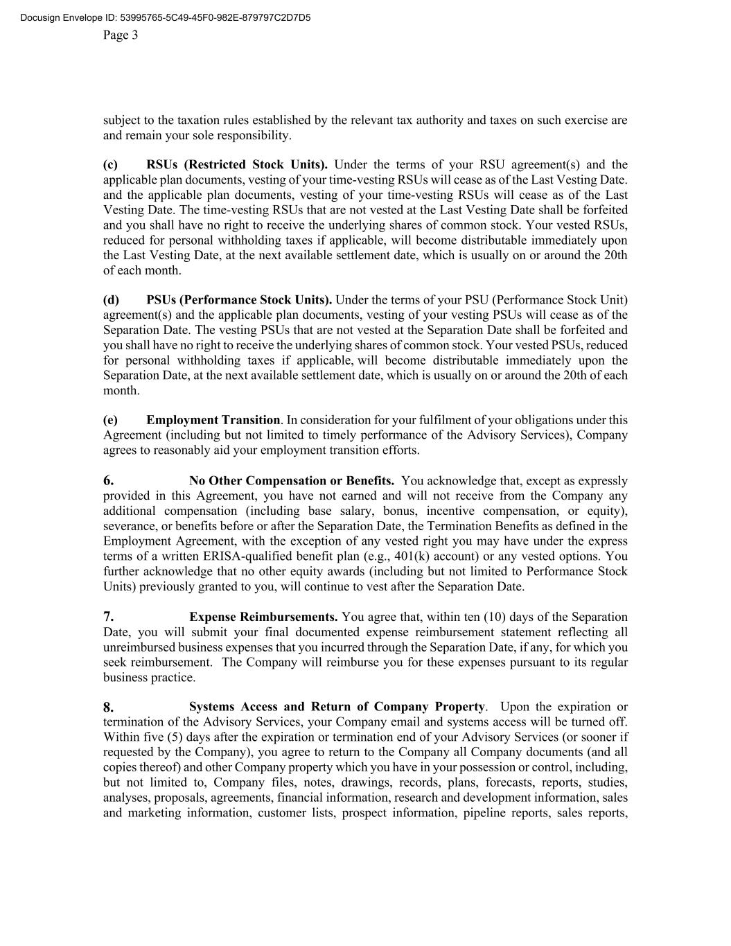 Page 3 subject to the taxation rules established by the relevant tax authority and taxes on such exercise are and remain your sole responsibility. (c) RSUs (Restricted Stock Units). Under the terms of your RSU agreement(s) and the applicable plan documents, vesting of your time-vesting RSUs will cease as of the Last Vesting Date. and the applicable plan documents, vesting of your time-vesting RSUs will cease as of the Last Vesting Date. The time-vesting RSUs that are not vested at the Last Vesting Date shall be forfeited and you shall have no right to receive the underlying shares of common stock. Your vested RSUs, reduced for personal withholding taxes if applicable, will become distributable immediately upon the Last Vesting Date, at the next available settlement date, which is usually on or around the 20th of each month. (d) PSUs (Performance Stock Units). Under the terms of your PSU (Performance Stock Unit) agreement(s) and the applicable plan documents, vesting of your vesting PSUs will cease as of the Separation Date. The vesting PSUs that are not vested at the Separation Date shall be forfeited and you shall have no right to receive the underlying shares of common stock. Your vested PSUs, reduced for personal withholding taxes if applicable, will become distributable immediately upon the Separation Date, at the next available settlement date, which is usually on or around the 20th of each month. (e) Employment Transition. In consideration for your fulfilment of your obligations under this Agreement (including but not limited to timely performance of the Advisory Services), Company agrees to reasonably aid your employment transition efforts. 6. No Other Compensation or Benefits. You acknowledge that, except as expressly provided in this Agreement, you have not earned and will not receive from the Company any additional compensation (including base salary, bonus, incentive compensation, or equity), severance, or benefits before or after the Separation Date, the Termination Benefits as defined in the Employment Agreement, with the exception of any vested right you may have under the express terms of a written ERISA-qualified benefit plan (e.g., 401(k) account) or any vested options. You further acknowledge that no other equity awards (including but not limited to Performance Stock Units) previously granted to you, will continue to vest after the Separation Date. 7. Expense Reimbursements. You agree that, within ten (10) days of the Separation Date, you will submit your final documented expense reimbursement statement reflecting all unreimbursed business expenses that you incurred through the Separation Date, if any, for which you seek reimbursement. The Company will reimburse you for these expenses pursuant to its regular business practice. 8. Systems Access and Return of Company Property. Upon the expiration or termination of the Advisory Services, your Company email and systems access will be turned off. Within five (5) days after the expiration or termination end of your Advisory Services (or sooner if requested by the Company), you agree to return to the Company all Company documents (and all copies thereof) and other Company property which you have in your possession or control, including, but not limited to, Company files, notes, drawings, records, plans, forecasts, reports, studies, analyses, proposals, agreements, financial information, research and development information, sales and marketing information, customer lists, prospect information, pipeline reports, sales reports, Docusign Envelope ID: 53995765-5C49-45F0-982E-879797C2D7D5