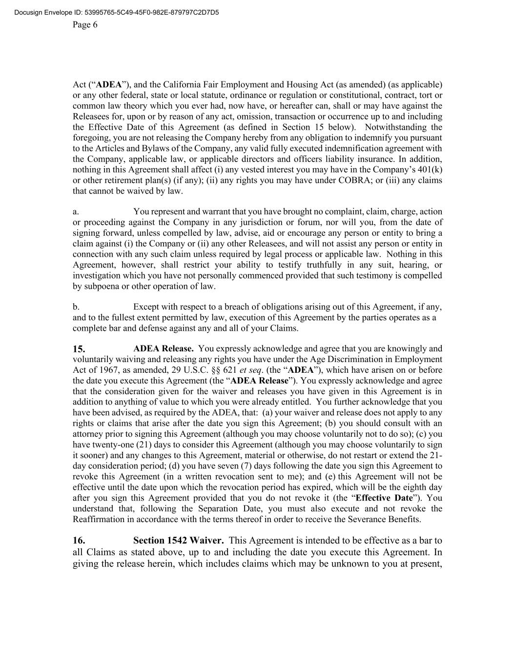 Page 6 Act (“ADEA”), and the California Fair Employment and Housing Act (as amended) (as applicable) or any other federal, state or local statute, ordinance or regulation or constitutional, contract, tort or common law theory which you ever had, now have, or hereafter can, shall or may have against the Releasees for, upon or by reason of any act, omission, transaction or occurrence up to and including the Effective Date of this Agreement (as defined in Section 15 below). Notwithstanding the foregoing, you are not releasing the Company hereby from any obligation to indemnify you pursuant to the Articles and Bylaws of the Company, any valid fully executed indemnification agreement with the Company, applicable law, or applicable directors and officers liability insurance. In addition, nothing in this Agreement shall affect (i) any vested interest you may have in the Company’s 401(k) or other retirement plan(s) (if any); (ii) any rights you may have under COBRA; or (iii) any claims that cannot be waived by law. a. You represent and warrant that you have brought no complaint, claim, charge, action or proceeding against the Company in any jurisdiction or forum, nor will you, from the date of signing forward, unless compelled by law, advise, aid or encourage any person or entity to bring a claim against (i) the Company or (ii) any other Releasees, and will not assist any person or entity in connection with any such claim unless required by legal process or applicable law. Nothing in this Agreement, however, shall restrict your ability to testify truthfully in any suit, hearing, or investigation which you have not personally commenced provided that such testimony is compelled by subpoena or other operation of law. b. Except with respect to a breach of obligations arising out of this Agreement, if any, and to the fullest extent permitted by law, execution of this Agreement by the parties operates as a complete bar and defense against any and all of your Claims. 15. ADEA Release. You expressly acknowledge and agree that you are knowingly and voluntarily waiving and releasing any rights you have under the Age Discrimination in Employment Act of 1967, as amended, 29 U.S.C. §§ 621 et seq. (the “ADEA”), which have arisen on or before the date you execute this Agreement (the “ADEA Release”). You expressly acknowledge and agree that the consideration given for the waiver and releases you have given in this Agreement is in addition to anything of value to which you were already entitled. You further acknowledge that you have been advised, as required by the ADEA, that: (a) your waiver and release does not apply to any rights or claims that arise after the date you sign this Agreement; (b) you should consult with an attorney prior to signing this Agreement (although you may choose voluntarily not to do so); (c) you have twenty-one (21) days to consider this Agreement (although you may choose voluntarily to sign it sooner) and any changes to this Agreement, material or otherwise, do not restart or extend the 21- day consideration period; (d) you have seven (7) days following the date you sign this Agreement to revoke this Agreement (in a written revocation sent to me); and (e) this Agreement will not be effective until the date upon which the revocation period has expired, which will be the eighth day after you sign this Agreement provided that you do not revoke it (the “Effective Date”). You understand that, following the Separation Date, you must also execute and not revoke the Reaffirmation in accordance with the terms thereof in order to receive the Severance Benefits. 16. Section 1542 Waiver. This Agreement is intended to be effective as a bar to all Claims as stated above, up to and including the date you execute this Agreement. In giving the release herein, which includes claims which may be unknown to you at present, Docusign Envelope ID: 53995765-5C49-45F0-982E-879797C2D7D5