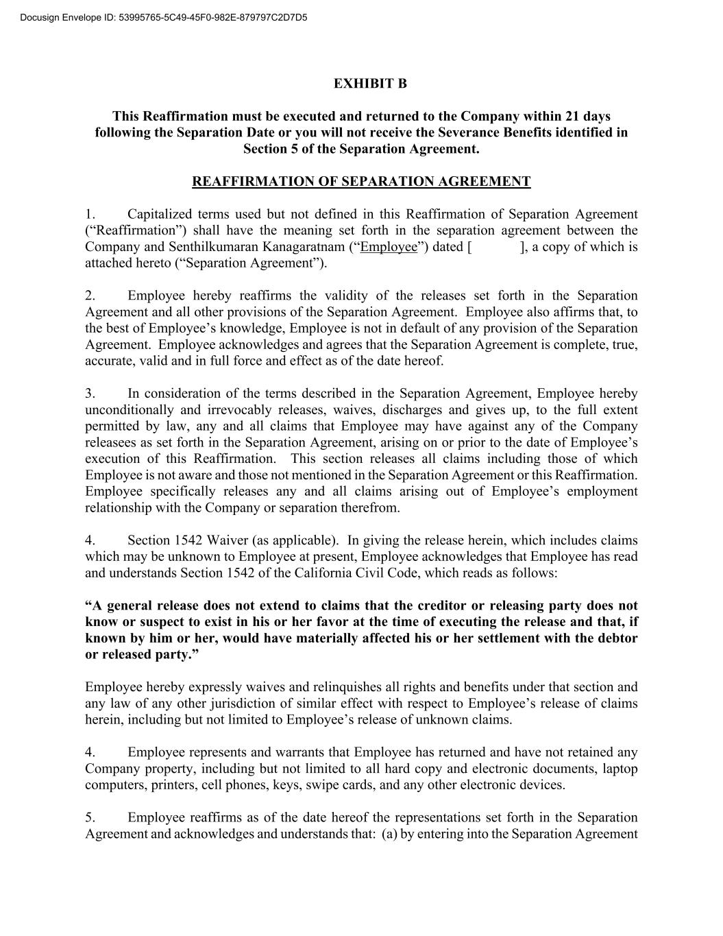 EXHIBIT B This Reaffirmation must be executed and returned to the Company within 21 days following the Separation Date or you will not receive the Severance Benefits identified in Section 5 of the Separation Agreement. REAFFIRMATION OF SEPARATION AGREEMENT 1. Capitalized terms used but not defined in this Reaffirmation of Separation Agreement (“Reaffirmation”) shall have the meaning set forth in the separation agreement between the Company and Senthilkumaran Kanagaratnam (“Employee”) dated [ ], a copy of which is attached hereto (“Separation Agreement”). 2. Employee hereby reaffirms the validity of the releases set forth in the Separation Agreement and all other provisions of the Separation Agreement. Employee also affirms that, to the best of Employee’s knowledge, Employee is not in default of any provision of the Separation Agreement. Employee acknowledges and agrees that the Separation Agreement is complete, true, accurate, valid and in full force and effect as of the date hereof. 3. In consideration of the terms described in the Separation Agreement, Employee hereby unconditionally and irrevocably releases, waives, discharges and gives up, to the full extent permitted by law, any and all claims that Employee may have against any of the Company releasees as set forth in the Separation Agreement, arising on or prior to the date of Employee’s execution of this Reaffirmation. This section releases all claims including those of which Employee is not aware and those not mentioned in the Separation Agreement or this Reaffirmation. Employee specifically releases any and all claims arising out of Employee’s employment relationship with the Company or separation therefrom. 4. Section 1542 Waiver (as applicable). In giving the release herein, which includes claims which may be unknown to Employee at present, Employee acknowledges that Employee has read and understands Section 1542 of the California Civil Code, which reads as follows: “A general release does not extend to claims that the creditor or releasing party does not know or suspect to exist in his or her favor at the time of executing the release and that, if known by him or her, would have materially affected his or her settlement with the debtor or released party.” Employee hereby expressly waives and relinquishes all rights and benefits under that section and any law of any other jurisdiction of similar effect with respect to Employee’s release of claims herein, including but not limited to Employee’s release of unknown claims. 4. Employee represents and warrants that Employee has returned and have not retained any Company property, including but not limited to all hard copy and electronic documents, laptop computers, printers, cell phones, keys, swipe cards, and any other electronic devices. 5. Employee reaffirms as of the date hereof the representations set forth in the Separation Agreement and acknowledges and understands that: (a) by entering into the Separation Agreement Docusign Envelope ID: 53995765-5C49-45F0-982E-879797C2D7D5