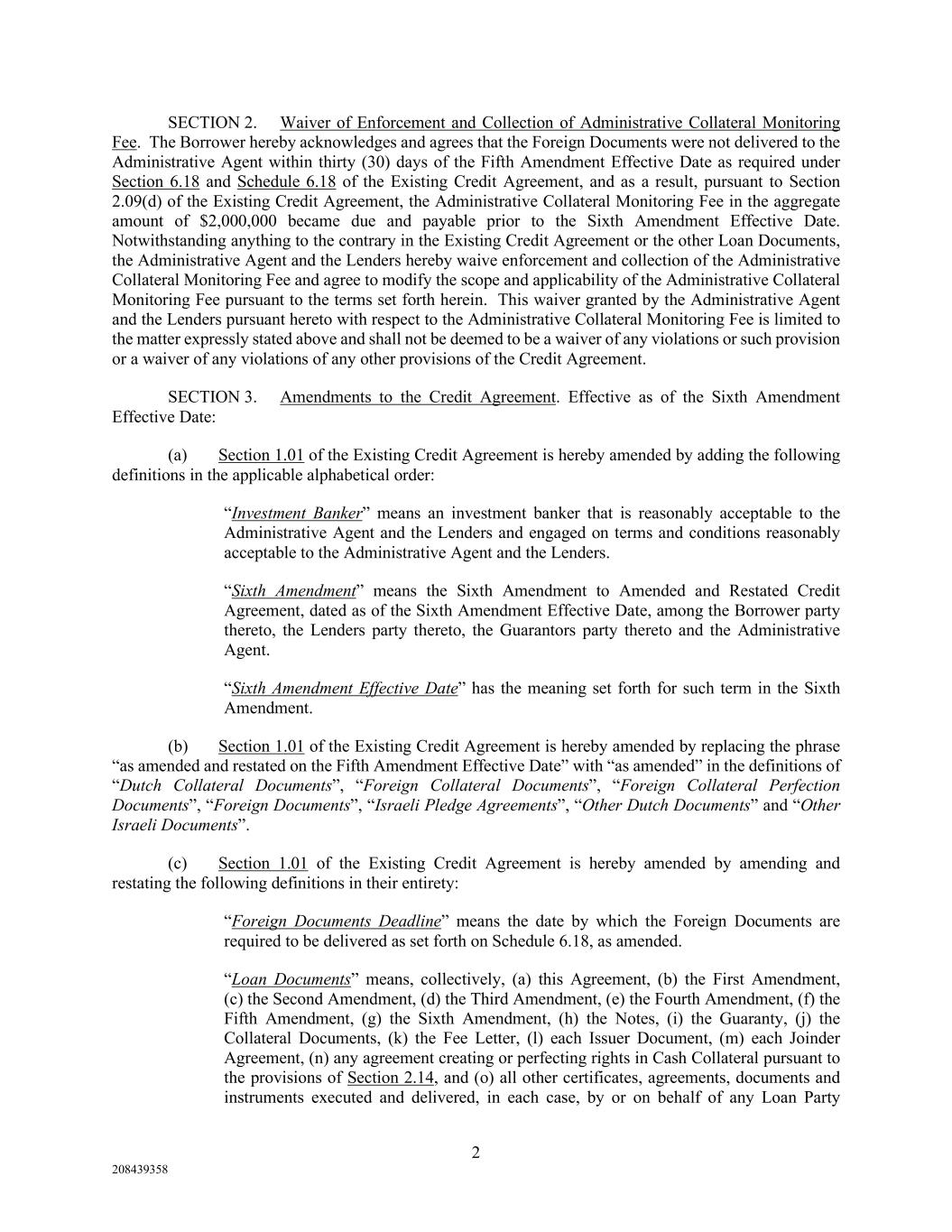 2 208439358 SECTION 2. Waiver of Enforcement and Collection of Administrative Collateral Monitoring Fee. The Borrower hereby acknowledges and agrees that the Foreign Documents were not delivered to the Administrative Agent within thirty (30) days of the Fifth Amendment Effective Date as required under Section 6.18 and Schedule 6.18 of the Existing Credit Agreement, and as a result, pursuant to Section 2.09(d) of the Existing Credit Agreement, the Administrative Collateral Monitoring Fee in the aggregate amount of $2,000,000 became due and payable prior to the Sixth Amendment Effective Date. Notwithstanding anything to the contrary in the Existing Credit Agreement or the other Loan Documents, the Administrative Agent and the Lenders hereby waive enforcement and collection of the Administrative Collateral Monitoring Fee and agree to modify the scope and applicability of the Administrative Collateral Monitoring Fee pursuant to the terms set forth herein. This waiver granted by the Administrative Agent and the Lenders pursuant hereto with respect to the Administrative Collateral Monitoring Fee is limited to the matter expressly stated above and shall not be deemed to be a waiver of any violations or such provision or a waiver of any violations of any other provisions of the Credit Agreement. SECTION 3. Amendments to the Credit Agreement. Effective as of the Sixth Amendment Effective Date: (a) Section 1.01 of the Existing Credit Agreement is hereby amended by adding the following definitions in the applicable alphabetical order: “Investment Banker” means an investment banker that is reasonably acceptable to the Administrative Agent and the Lenders and engaged on terms and conditions reasonably acceptable to the Administrative Agent and the Lenders. “Sixth Amendment” means the Sixth Amendment to Amended and Restated Credit Agreement, dated as of the Sixth Amendment Effective Date, among the Borrower party thereto, the Lenders party thereto, the Guarantors party thereto and the Administrative Agent. “Sixth Amendment Effective Date” has the meaning set forth for such term in the Sixth Amendment. (b) Section 1.01 of the Existing Credit Agreement is hereby amended by replacing the phrase “as amended and restated on the Fifth Amendment Effective Date” with “as amended” in the definitions of “Dutch Collateral Documents”, “Foreign Collateral Documents”, “Foreign Collateral Perfection Documents”, “Foreign Documents”, “Israeli Pledge Agreements”, “Other Dutch Documents” and “Other Israeli Documents”. (c) Section 1.01 of the Existing Credit Agreement is hereby amended by amending and restating the following definitions in their entirety: “Foreign Documents Deadline” means the date by which the Foreign Documents are required to be delivered as set forth on Schedule 6.18, as amended. “Loan Documents” means, collectively, (a) this Agreement, (b) the First Amendment, (c) the Second Amendment, (d) the Third Amendment, (e) the Fourth Amendment, (f) the Fifth Amendment, (g) the Sixth Amendment, (h) the Notes, (i) the Guaranty, (j) the Collateral Documents, (k) the Fee Letter, (l) each Issuer Document, (m) each Joinder Agreement, (n) any agreement creating or perfecting rights in Cash Collateral pursuant to the provisions of Section 2.14, and (o) all other certificates, agreements, documents and instruments executed and delivered, in each case, by or on behalf of any Loan Party