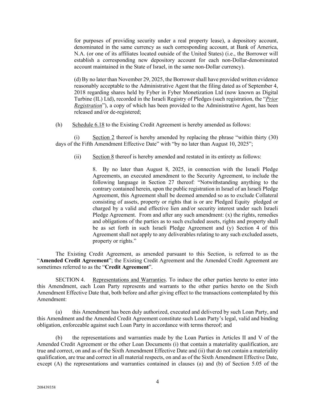 4 208439358 for purposes of providing security under a real property lease), a depository account, denominated in the same currency as such corresponding account, at Bank of America, N.A. (or one of its affiliates located outside of the United States) (i.e., the Borrower will establish a corresponding new depository account for each non-Dollar-denominated account maintained in the State of Israel, in the same non-Dollar currency). (d) By no later than November 29, 2025, the Borrower shall have provided written evidence reasonably acceptable to the Administrative Agent that the filing dated as of September 4, 2018 regarding shares held by Fyber in Fyber Monetization Ltd (now known as Digital Turbine (IL) Ltd), recorded in the Israeli Registry of Pledges (such registration, the “Prior Registration”), a copy of which has been provided to the Administrative Agent, has been released and/or de-registered; (h) Schedule 6.18 to the Existing Credit Agreement is hereby amended as follows: (i) Section 2 thereof is hereby amended by replacing the phrase “within thirty (30) days of the Fifth Amendment Effective Date” with “by no later than August 10, 2025”; (ii) Section 8 thereof is hereby amended and restated in its entirety as follows: 8. By no later than August 8, 2025, in connection with the Israeli Pledge Agreements, an executed amendment to the Security Agreement, to include the following language in Section 27 thereof: “Notwithstanding anything to the contrary contained herein, upon the public registration in Israel of an Israeli Pledge Agreement, this Agreement shall be deemed amended so as to exclude Collateral consisting of assets, property or rights that is or are Pledged Equity pledged or charged by a valid and effective lien and/or security interest under such Israeli Pledge Agreement. From and after any such amendment: (x) the rights, remedies and obligations of the parties as to such excluded assets, rights and property shall be as set forth in such Israeli Pledge Agreement and (y) Section 4 of this Agreement shall not apply to any deliverables relating to any such excluded assets, property or rights.” The Existing Credit Agreement, as amended pursuant to this Section, is referred to as the “Amended Credit Agreement”; the Existing Credit Agreement and the Amended Credit Agreement are sometimes referred to as the “Credit Agreement”. SECTION 4. Representations and Warranties. To induce the other parties hereto to enter into this Amendment, each Loan Party represents and warrants to the other parties hereto on the Sixth Amendment Effective Date that, both before and after giving effect to the transactions contemplated by this Amendment: (a) this Amendment has been duly authorized, executed and delivered by such Loan Party, and this Amendment and the Amended Credit Agreement constitute such Loan Party’s legal, valid and binding obligation, enforceable against such Loan Party in accordance with terms thereof; and (b) the representations and warranties made by the Loan Parties in Articles II and V of the Amended Credit Agreement or the other Loan Documents (i) that contain a materiality qualification, are true and correct, on and as of the Sixth Amendment Effective Date and (ii) that do not contain a materiality qualification, are true and correct in all material respects, on and as of the Sixth Amendment Effective Date, except (A) the representations and warranties contained in clauses (a) and (b) of Section 5.05 of the