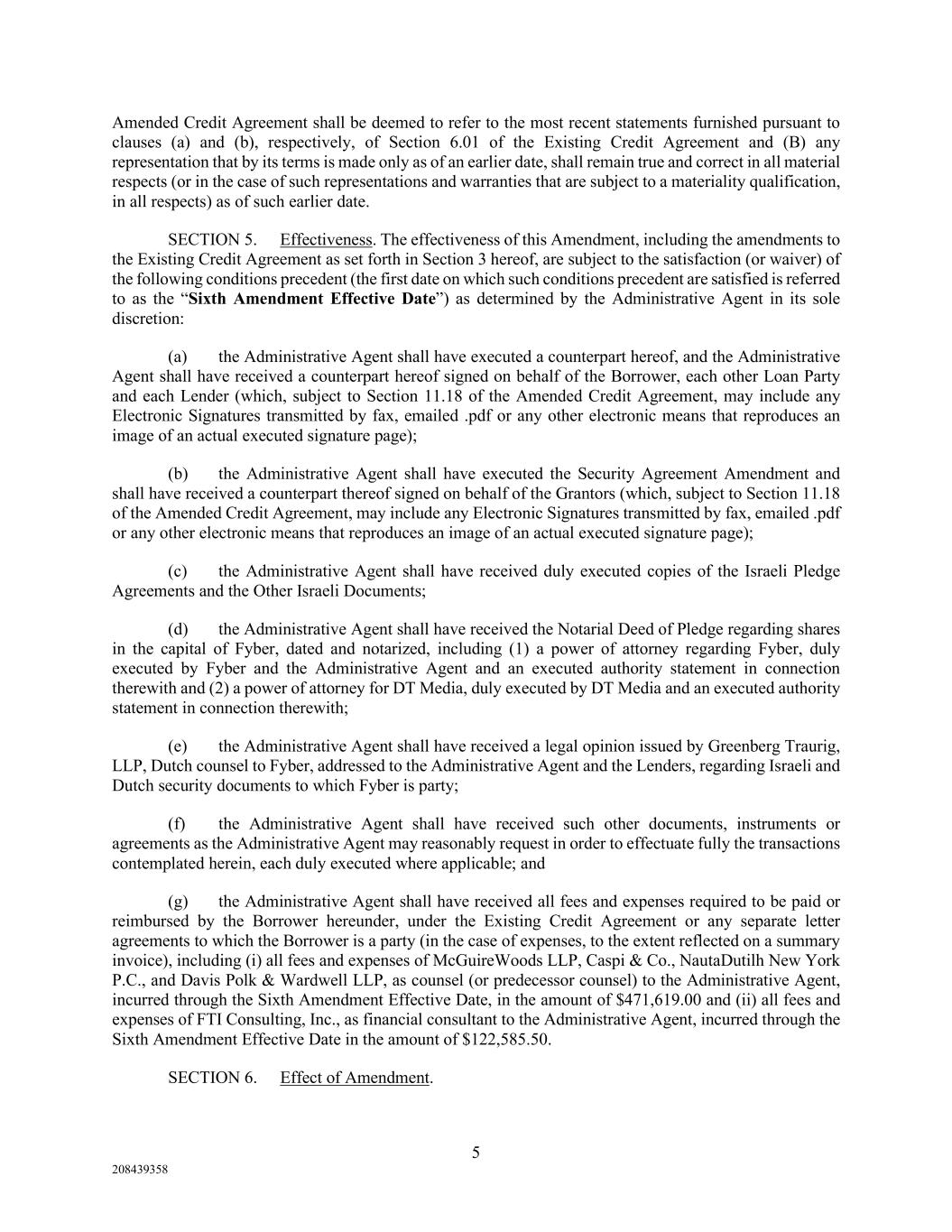 5 208439358 Amended Credit Agreement shall be deemed to refer to the most recent statements furnished pursuant to clauses (a) and (b), respectively, of Section 6.01 of the Existing Credit Agreement and (B) any representation that by its terms is made only as of an earlier date, shall remain true and correct in all material respects (or in the case of such representations and warranties that are subject to a materiality qualification, in all respects) as of such earlier date. SECTION 5. Effectiveness. The effectiveness of this Amendment, including the amendments to the Existing Credit Agreement as set forth in Section 3 hereof, are subject to the satisfaction (or waiver) of the following conditions precedent (the first date on which such conditions precedent are satisfied is referred to as the “Sixth Amendment Effective Date”) as determined by the Administrative Agent in its sole discretion: (a) the Administrative Agent shall have executed a counterpart hereof, and the Administrative Agent shall have received a counterpart hereof signed on behalf of the Borrower, each other Loan Party and each Lender (which, subject to Section 11.18 of the Amended Credit Agreement, may include any Electronic Signatures transmitted by fax, emailed .pdf or any other electronic means that reproduces an image of an actual executed signature page); (b) the Administrative Agent shall have executed the Security Agreement Amendment and shall have received a counterpart thereof signed on behalf of the Grantors (which, subject to Section 11.18 of the Amended Credit Agreement, may include any Electronic Signatures transmitted by fax, emailed .pdf or any other electronic means that reproduces an image of an actual executed signature page); (c) the Administrative Agent shall have received duly executed copies of the Israeli Pledge Agreements and the Other Israeli Documents; (d) the Administrative Agent shall have received the Notarial Deed of Pledge regarding shares in the capital of Fyber, dated and notarized, including (1) a power of attorney regarding Fyber, duly executed by Fyber and the Administrative Agent and an executed authority statement in connection therewith and (2) a power of attorney for DT Media, duly executed by DT Media and an executed authority statement in connection therewith; (e) the Administrative Agent shall have received a legal opinion issued by Greenberg Traurig, LLP, Dutch counsel to Fyber, addressed to the Administrative Agent and the Lenders, regarding Israeli and Dutch security documents to which Fyber is party; (f) the Administrative Agent shall have received such other documents, instruments or agreements as the Administrative Agent may reasonably request in order to effectuate fully the transactions contemplated herein, each duly executed where applicable; and (g) the Administrative Agent shall have received all fees and expenses required to be paid or reimbursed by the Borrower hereunder, under the Existing Credit Agreement or any separate letter agreements to which the Borrower is a party (in the case of expenses, to the extent reflected on a summary invoice), including (i) all fees and expenses of McGuireWoods LLP, Caspi & Co., NautaDutilh New York P.C., and Davis Polk & Wardwell LLP, as counsel (or predecessor counsel) to the Administrative Agent, incurred through the Sixth Amendment Effective Date, in the amount of $471,619.00 and (ii) all fees and expenses of FTI Consulting, Inc., as financial consultant to the Administrative Agent, incurred through the Sixth Amendment Effective Date in the amount of $122,585.50. SECTION 6. Effect of Amendment.